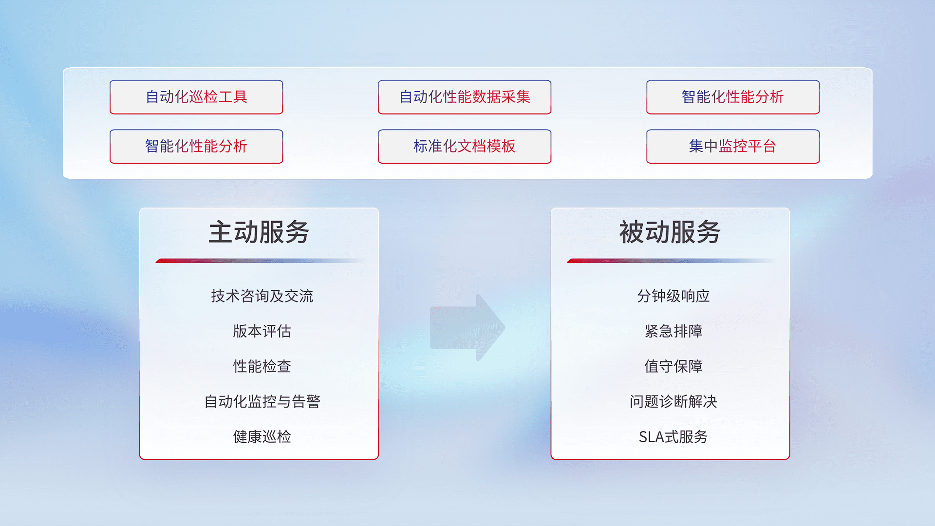 智能化工具和标准化文档,,,,保障服务质量,,提供主动服务(包含技术咨询、、、版本评估、、、性能检查、、自动化监控与告警、、、健康巡检)和被动服务包含(分钟级响应、、、紧急排障、、值守保障、、、、问题诊断解决、、、SLA服务)。。。