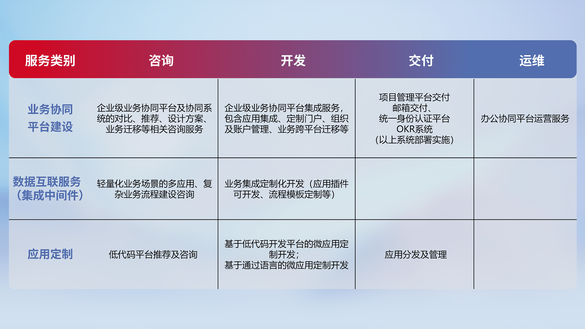 针对钉钉、、、、企微、、、、IDaas等平台级产品提供产品的规划、、、、方案、、交付、、、、定制化开发等服务,,,,实现如统一协同办公、、、、智能客户服务、、、、混合会议管理、、、智能数据查询、、、、等业务场景,,,,实现数字化转型。。